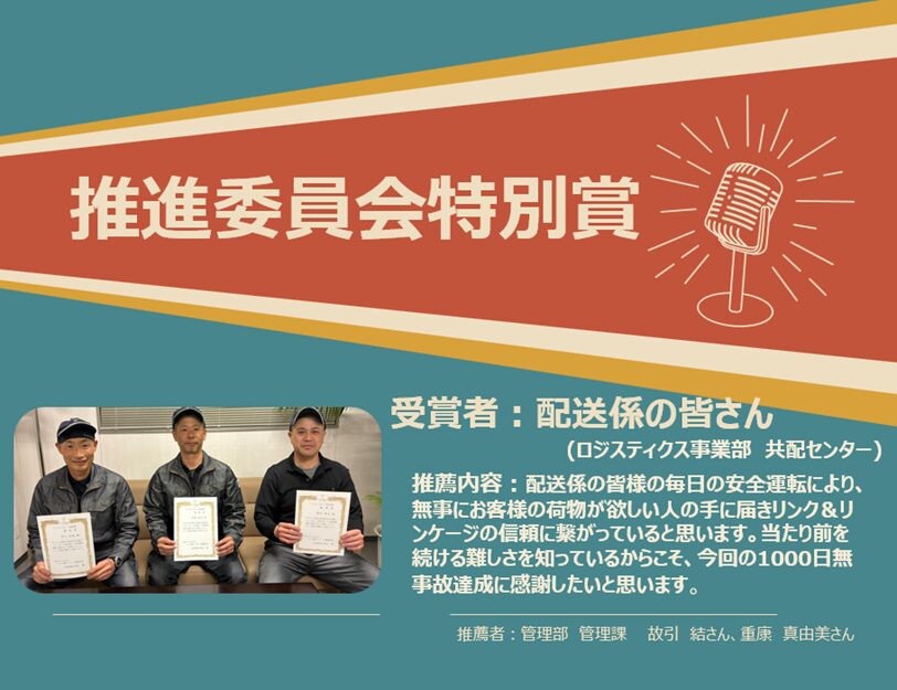『いいモノはいい』第2四半期を振り返るにあたり、今回最も印象的だったのは、配送係の皆さんが 1000日無事故を達成し表彰されたこと です。